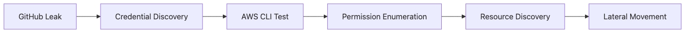 The diagram above illustrates how attackers discover exposed AWS credentials in public repositories and exploit them systematically. The attack progresses from automated credential scanning through validation, enumeration, resource discovery, and ultimately data exfiltration with lateral movement capabilities.