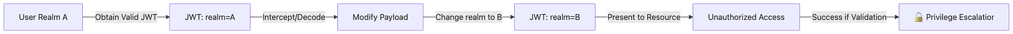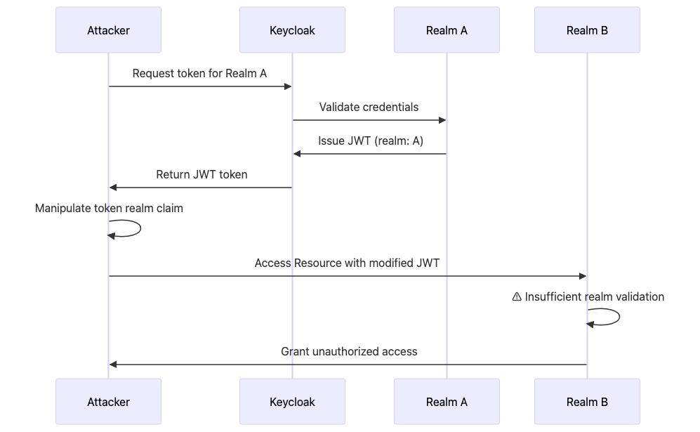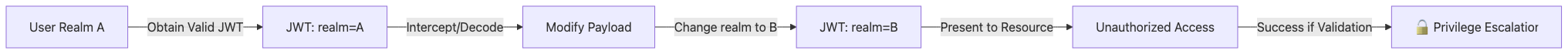 Threat Model: An attacker attempts to escalate privileges by forging or manipulating JWT tokens to access resources in other realms.