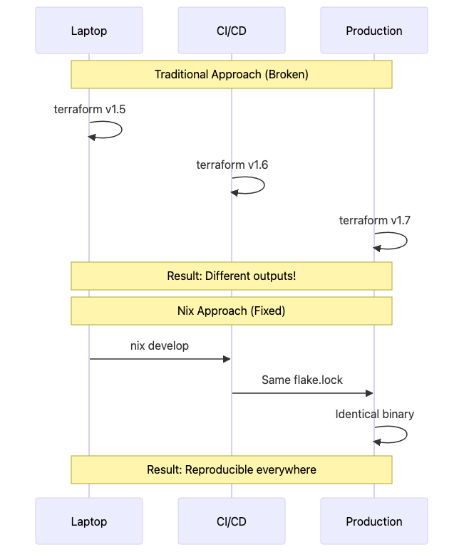 Nix solution: one flake.nix defines your exact toolchain. Developers run nix develop, GitHub Actions runs nix develop --command terraform apply, production NixOS servers use the same pinned derivations. Everyone gets Terraform 1.6.2 from the exact same nixpkgs commit, down to the same linked OpenSSL libraries and libffi versions.