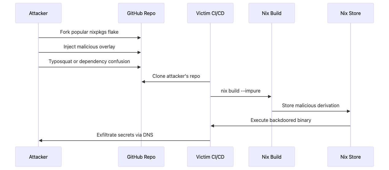 Flake input poisoning exploits the trust relationship between Nix projects and their declared dependencies, targeting the weakest link in the supply chain: unpinned or unverified upstream repositories. When DevOps teams reference flake inputs using branch names or tags instead of immutable commit hashes, they create an attack window where compromised upstream maintainers or GitHub account takeovers can inject malicious code that propagates to every downstream build. This technique is particularly effective in CI/CD pipelines that run nix flake update automatically, environments using floating references like github:NixOS/nixpkgs/master, or teams that don’t commit flake.lock to version control, leaving every build vulnerable to supply chain compromise at evaluation time before any sandboxing occurs.