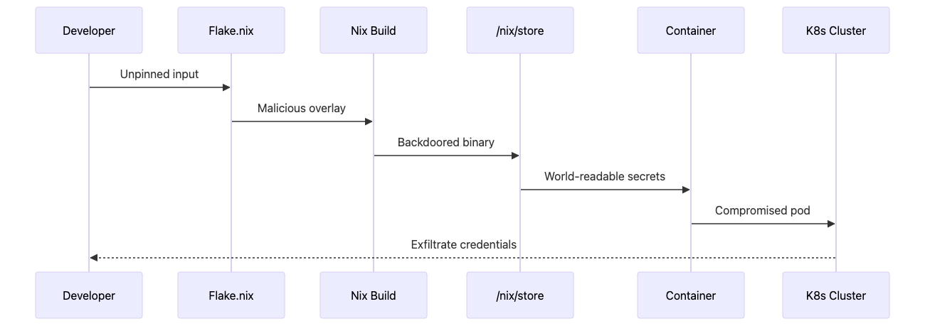 /nix/storeisdr-xr-xr-x) - Anyone with shell access can enumerate all installed packages, their versions, build scripts, and potentially embedded credentials. This is by design for Nix’s content-addressed storage, but becomes dangerous when developers don’t understand the implications.Unverified flake inputs (no signature verification by default) - When you write