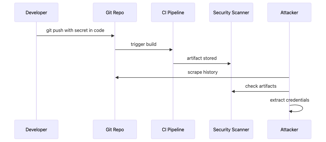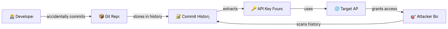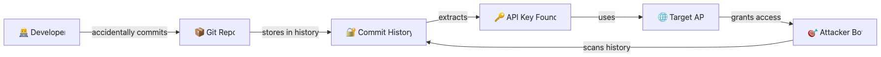 Attack Flow: Developer accidentally commits API keys/passwords → Git stores in history forever → Attacker scans repos with gitleaks/truffleHog → Finds credentials in commit diffs → Uses keys to access APIs, databases, cloud accounts. Even after deletion, secrets persist in .git objects, forks, and CI caches. Impact: Full compromise of associated resources, lateral movement via IAM roles, data exfiltration.