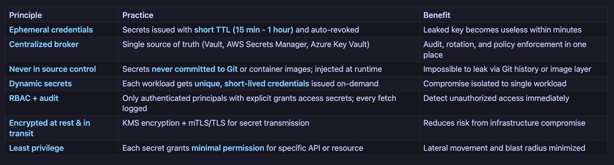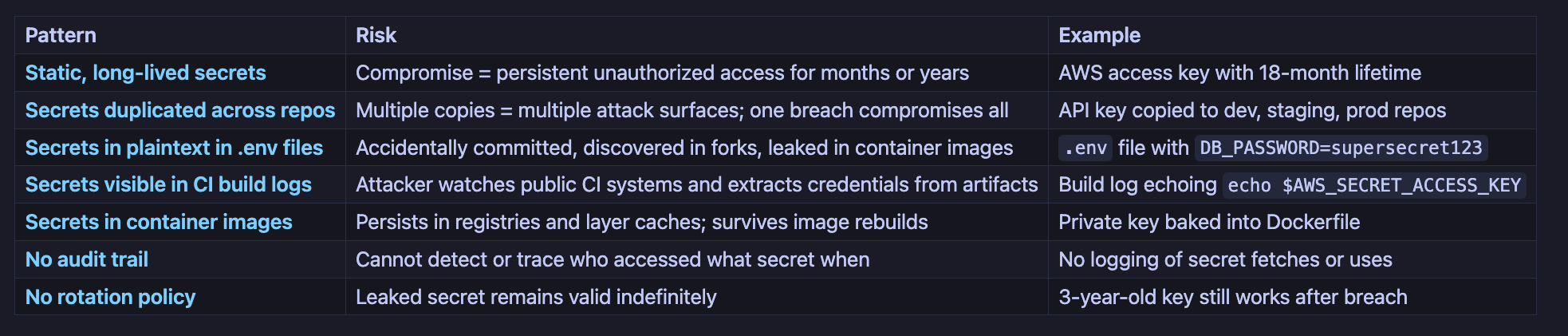 The fundamental problem: Secrets are treated like code (checked in, versioned, replicated) when they should be treated like ephemeral, least-privilege, short-lived tokens.