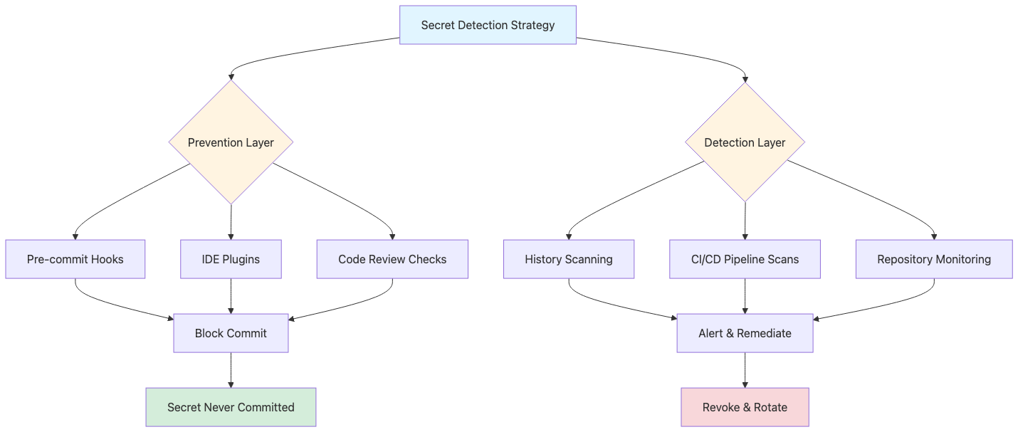 Multi-layered defense strategy preventing secrets from entering Git, detecting leaks post-commit, and rapid incident response when breaches occur.