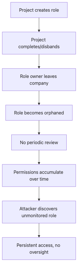 Orphan roles are the digital equivalent of master keys that nobody remembers creating. These roles typically originate from disbanded projects, departed employees, or organizational restructuring. Without clear ownership, they escape regular review cycles and accumulate permissions over time. Attackers target these roles because they offer persistent access with minimal oversight. The challenge is that removing an orphan role requires understanding its purpose, but the context has been lost. Organizations often keep these roles "just in case," creating permanent attack vectors.