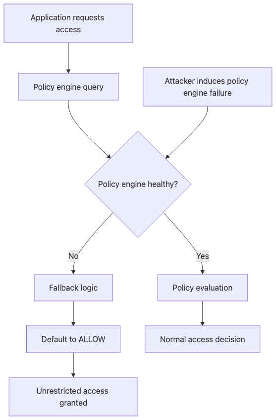 Scenario: OPA/policy engine returns 500, app defaults to ALLOW instead of DENY.