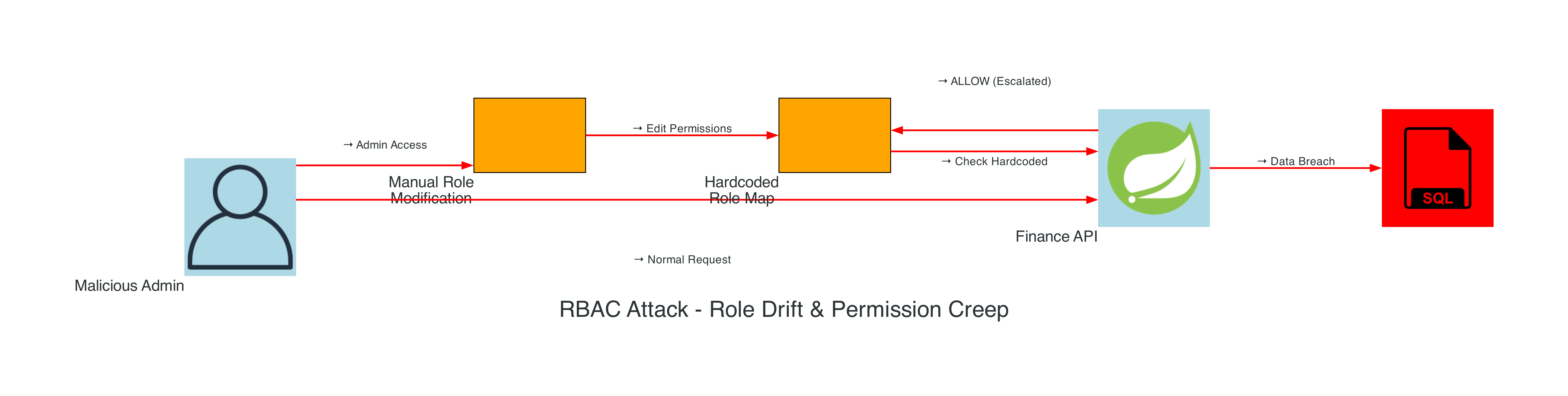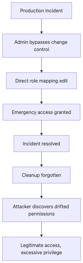 This attack represents the classic "emergency access" trap that haunts enterprise environments. During production incidents, administrators bypass normal change management to quickly grant permissions, intending to review and revert changes later. However, post-incident cleanup rarely happens completely. The attack window opens when these temporary privileges become permanent through neglect. Attackers who compromise accounts with drifted roles gain access far beyond what the user should have. The insidious nature of this attack is that it appears legitimate in logs - the user has valid permissions, just more than intended.