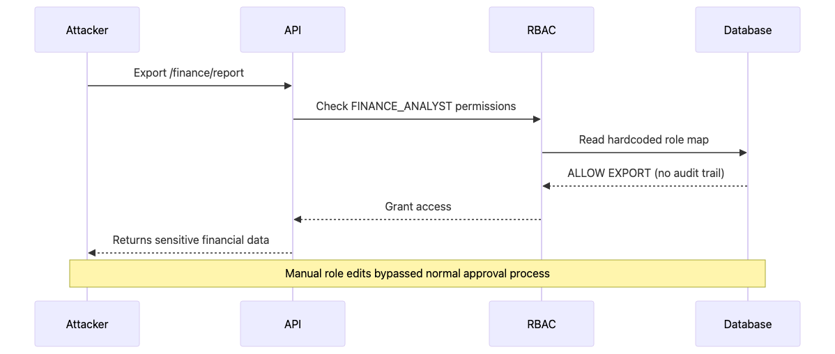 read access. A hurried ops script manually edited a role → permissions map to unblock a report. Weeks later a contractor still had export capability; audit logs lacked the decision trace. Exfiltration disguised as normal export volume passed undetected.