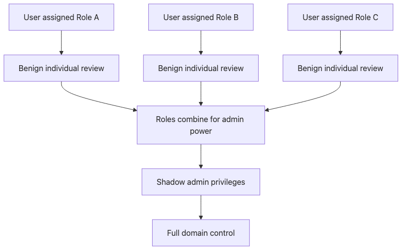allows creating accounts, accessing all data through backups, and hiding activities in logs. Attackers patient enough to accumulate roles gradually can achieve domain admin equivalent access while flying under traditional monitoring radars. The attack is particularly effective in matrix organizations where users legitimately need multiple roles across different business functions.